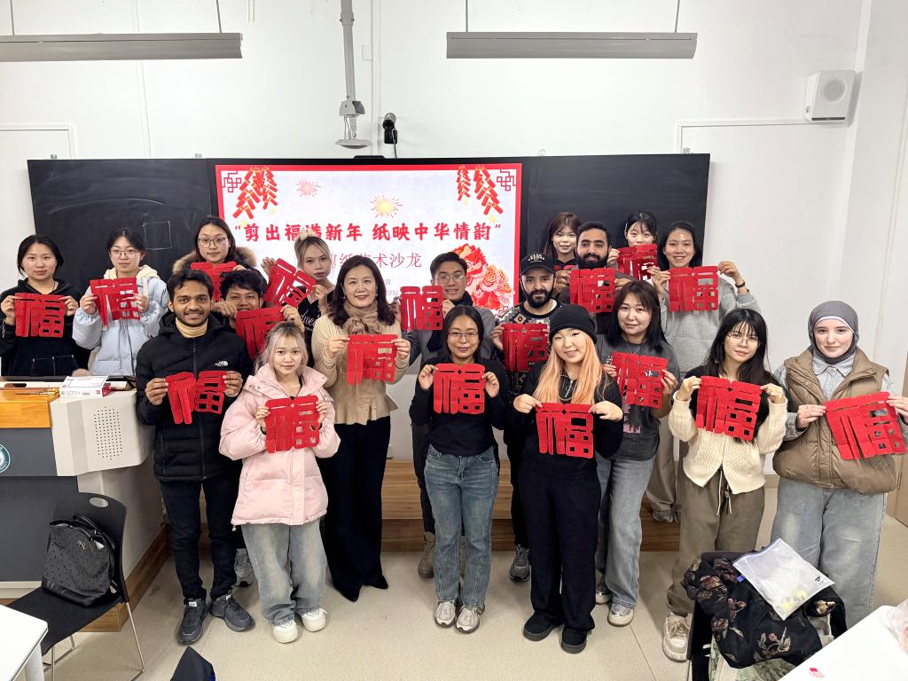 邀请我校外聘教授唐蔚前来授课,带领留学生深入学习剪纸艺术的历史渊源、文化寓意以及“福”字的剪法技巧,展示了剪纸艺术的独特魅力,同时借此机会为留学生送上新年的美好祝福。