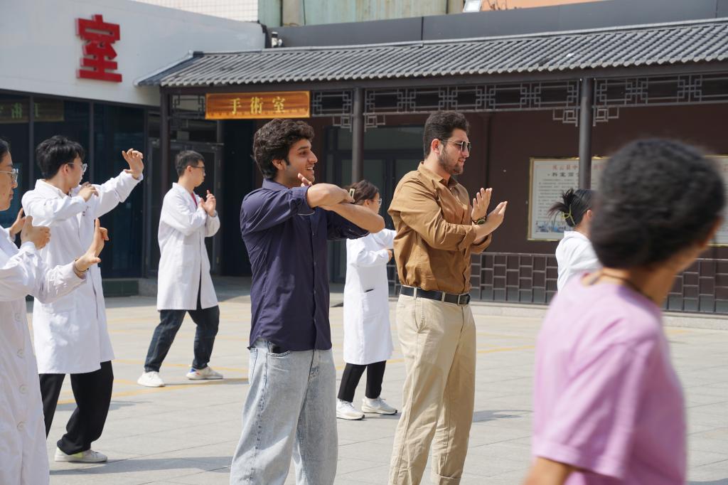 在各位医师的带领下,留学生首次体验了中华传统健身功法—八段锦,同学们认真学习着一招一式,一套练习过后,大家纷纷表示感觉肌肉舒展、精神放松、充满活力。
